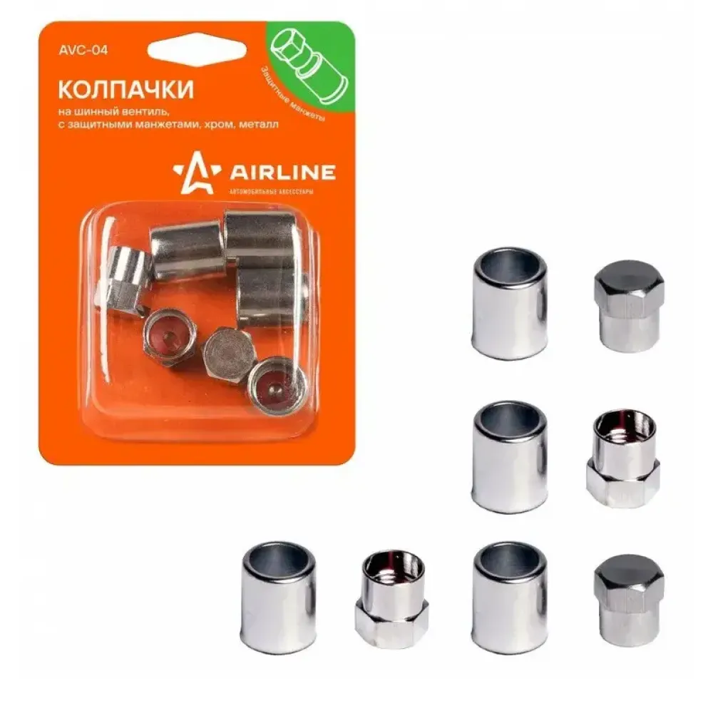 Колпачки на шинный вентиль Airline с защитными манжетами 4+4 шт AVC-04 предназначены для защиты шинного вентиля от попадания загрязнений и жидкости. Колпачки помогают создать герметичность внутри шины автомобиля, создавая барьер для травления воздуха. Данный набор колпачков имеет металлические втулки- манжеты для защиты шинного вентиля от повреждений. Колпачки имеют металлический корпус и расцветку «хром». Походят для автомобилей, мотоциклов, велосипедов.