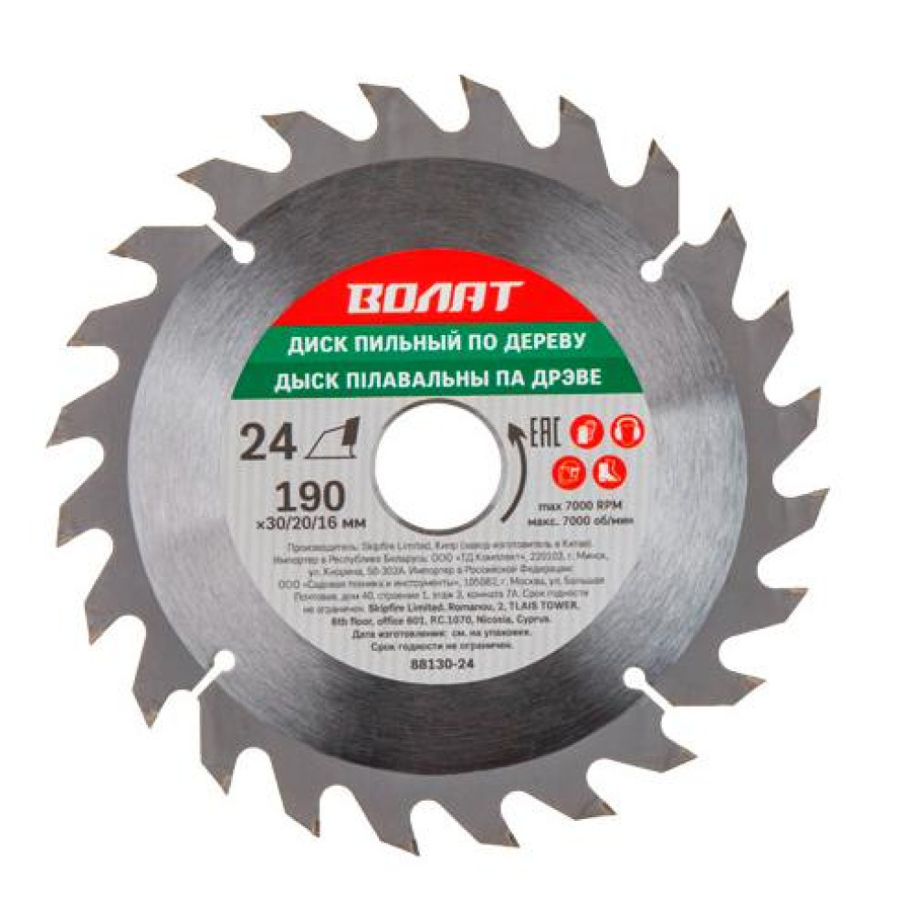 Технические характеристики Диск пильный ВОЛАТ 190х30/20/16z24 (88130-24)