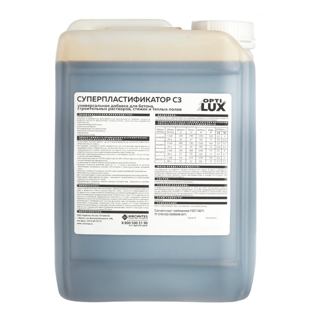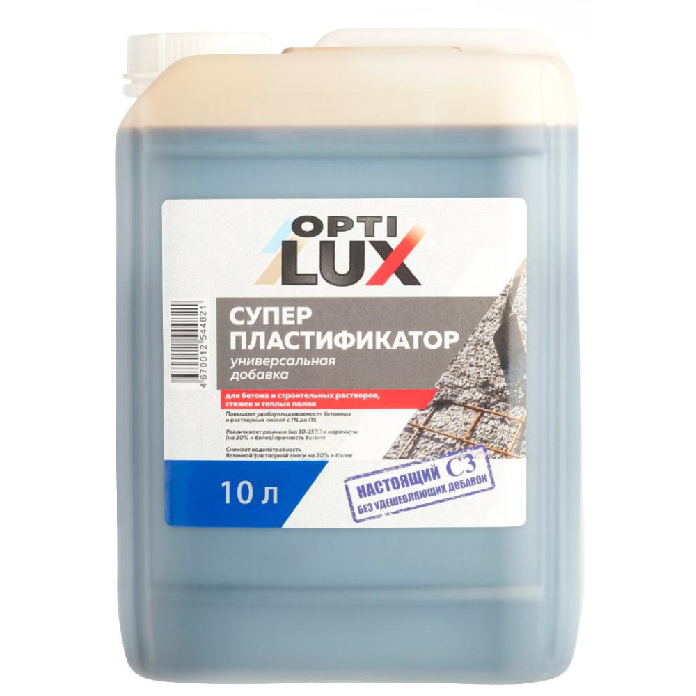Добавка ОПТИЛЮКС С3 СУПЕРПЛАСТИФИКАТОР для бетонов и строительных растворов 10л применяется в производстве: товарного бетона, сборных и монолитных железобетонных конструкций из тяжелого, легкого и ячеистого бетона в гражданском, промышленном, транспортном и дорожном строительстве, ремонтных и кладочных растворов, бетонов на пористых заполнителях, тротуарной плитки, шлакоблоков, еврозаборов, теплых полов, стяжек, наливных полов. Соответствует требованиям ГОСТ 24211.
