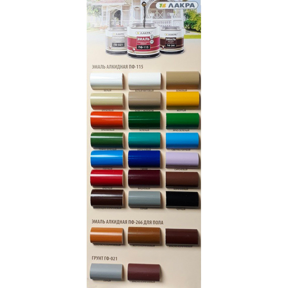 Эмаль ПФ-115 Лакра применяется для окраски деревянных, металлических, бетонных, цементных и других поверхностей, подвергающихся атмосферным воздействиям, а также для внутренних отделочных работ: окраски оконных рам, подоконников, дверей, батарей, различных деревянных и металлических предметов.