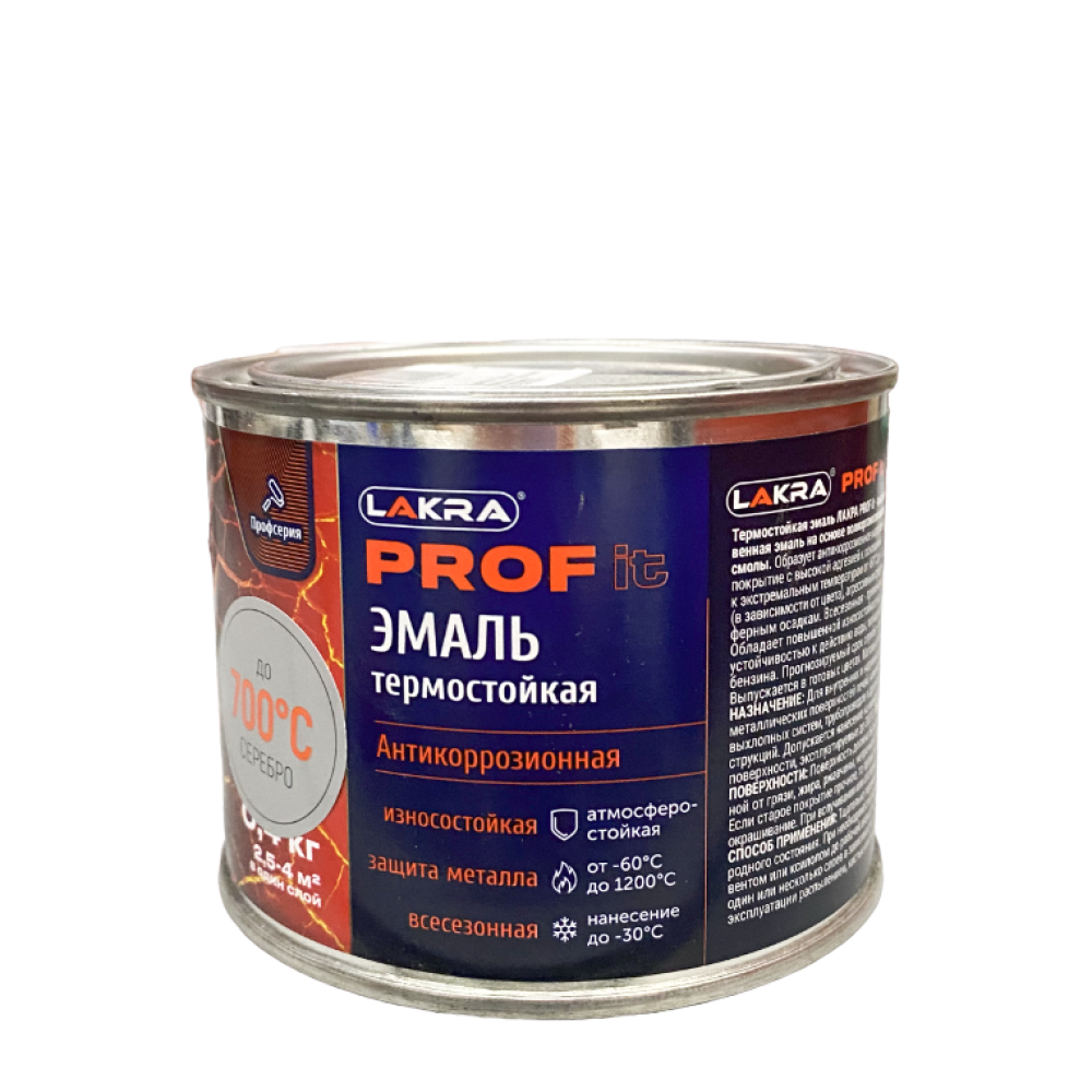 Высококачественная эмаль Лакра PROF IT на основе полиорганосилоксановой смолы для внутренних и наружных работ. Образует антикоррозионное жаропрочное покрытие с высокой адгезией к основанию, стойкое к экстремальным температурам, агрессивным средам и атмосферным осадкам. Возможно применение при отрицательных температурах до -30°С.