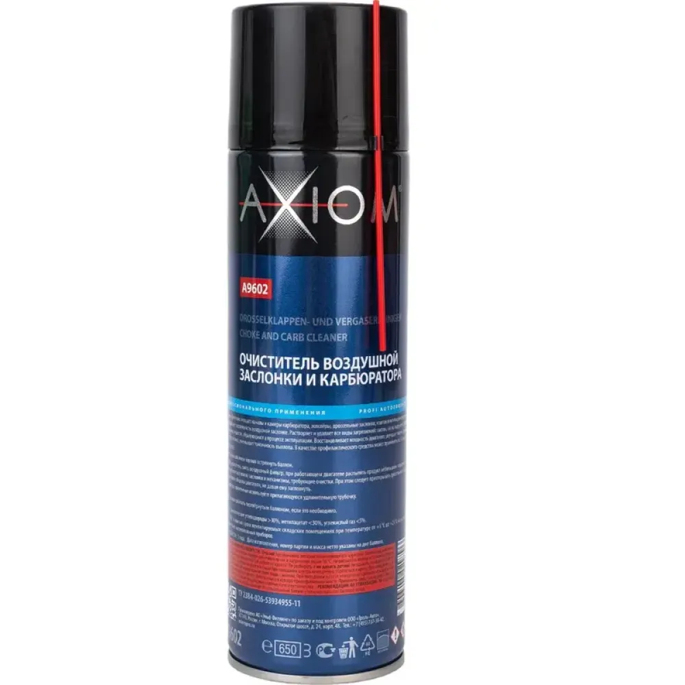 Очиститель AXIOM 650мл (A9602) быстро и эффективно очищает каналы и камеры карбюратора, жиклеры, дроссельные заслонки, клапан вентиляции картерных газов, возвращает подвижность воздушной заслонке. Растворяет и удаляет все виды загрязнений: смолы, нагар и другие отложения отработанных веществ, образующихся в процессе эксплуатации.