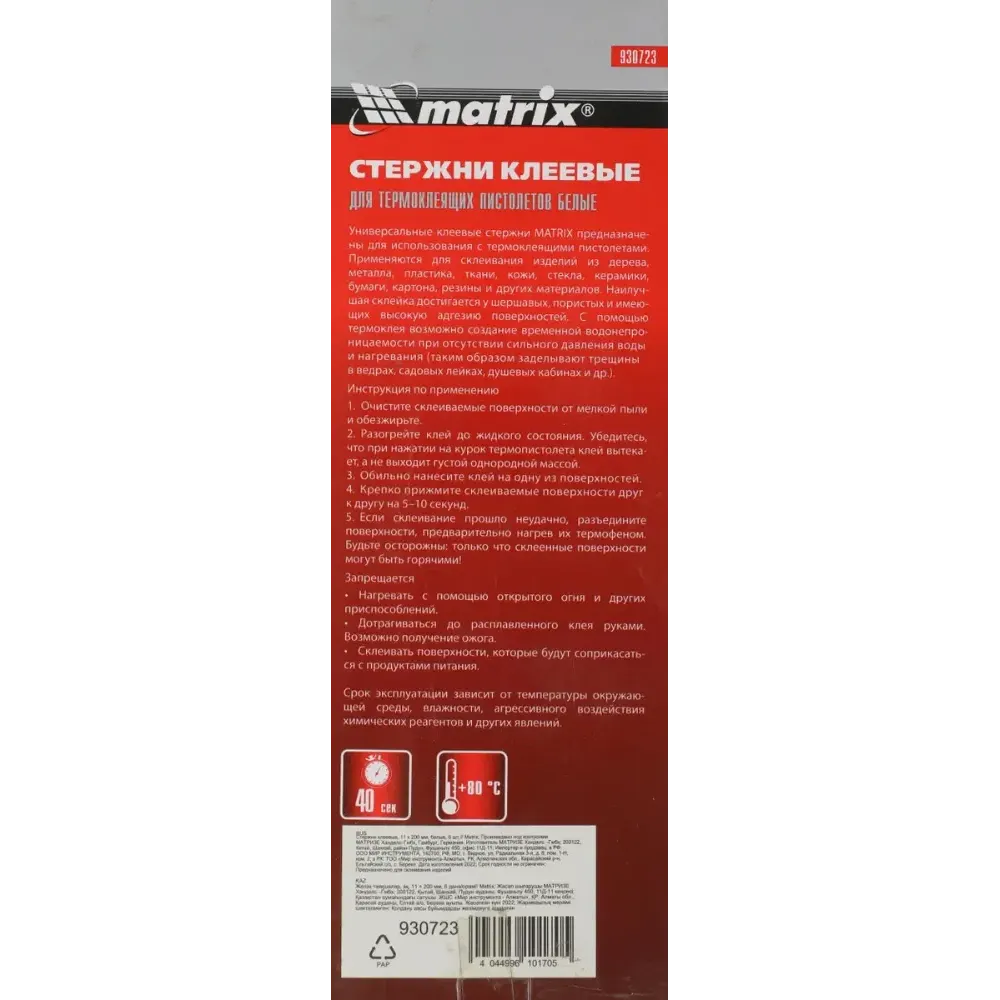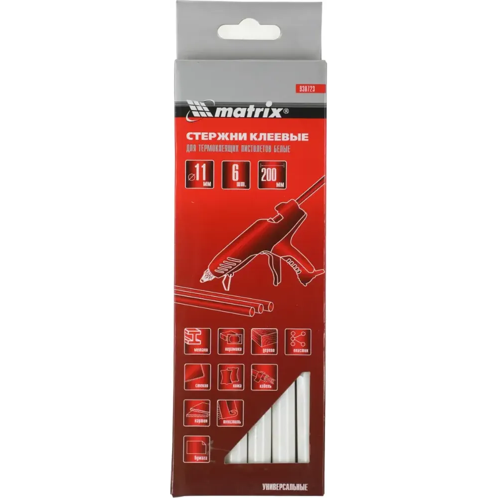 Технические характеристики Стержни клеевые MATRIX 11*200 мм, 6 шт белые (930723)