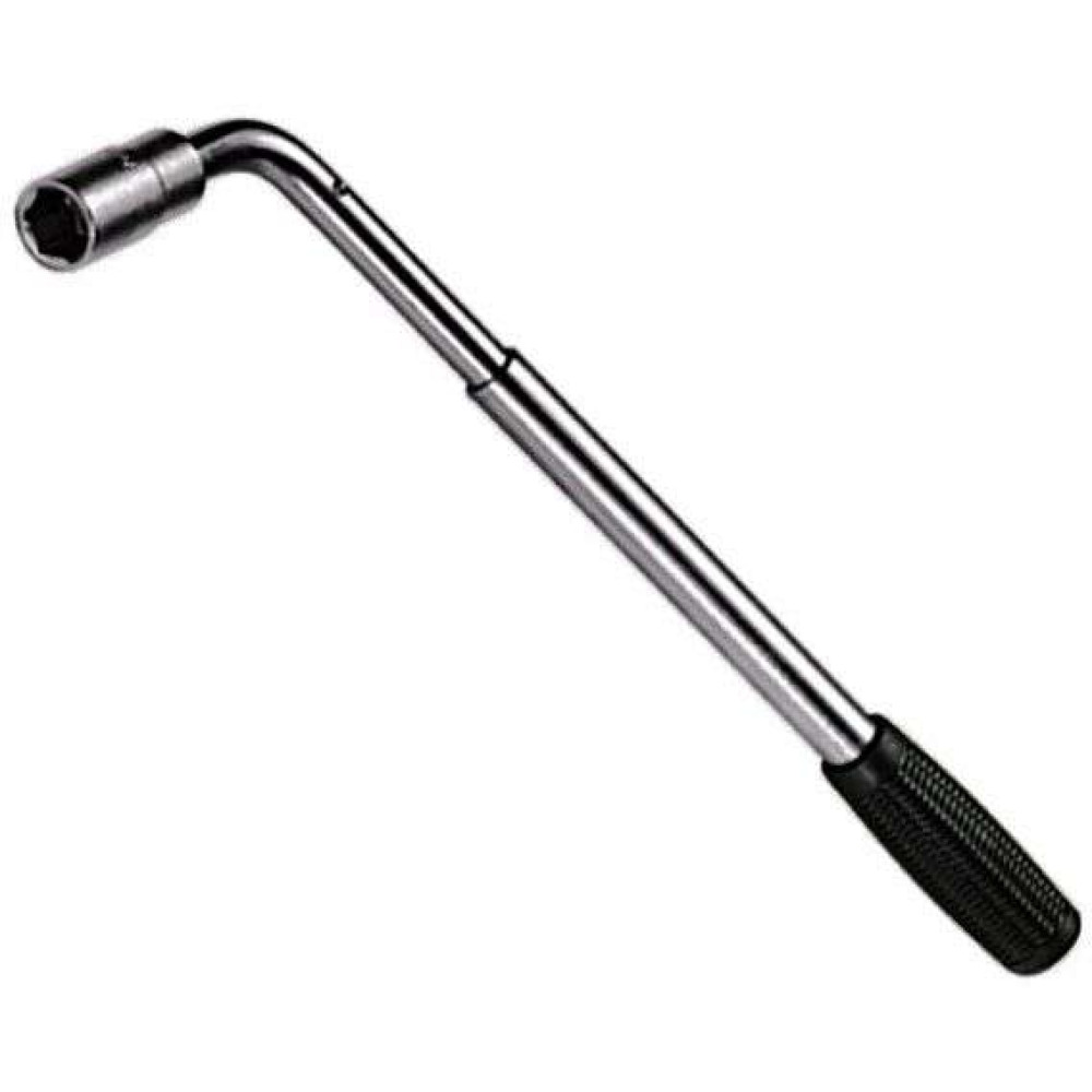 Ключ баллонный телескопический Г-образный изготавливается из хромованадиевой стали и имеет хромоникелевое покрытие. Телескопическая рукоятка позволяет менять длину рычага (300–450 мм) и регулировать усилие на откручивание или закручивание болтовых соединений.
