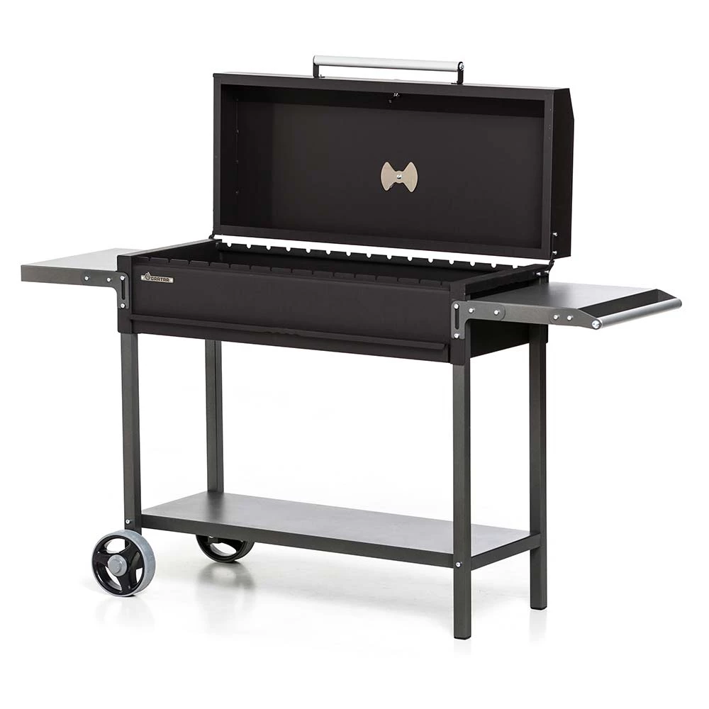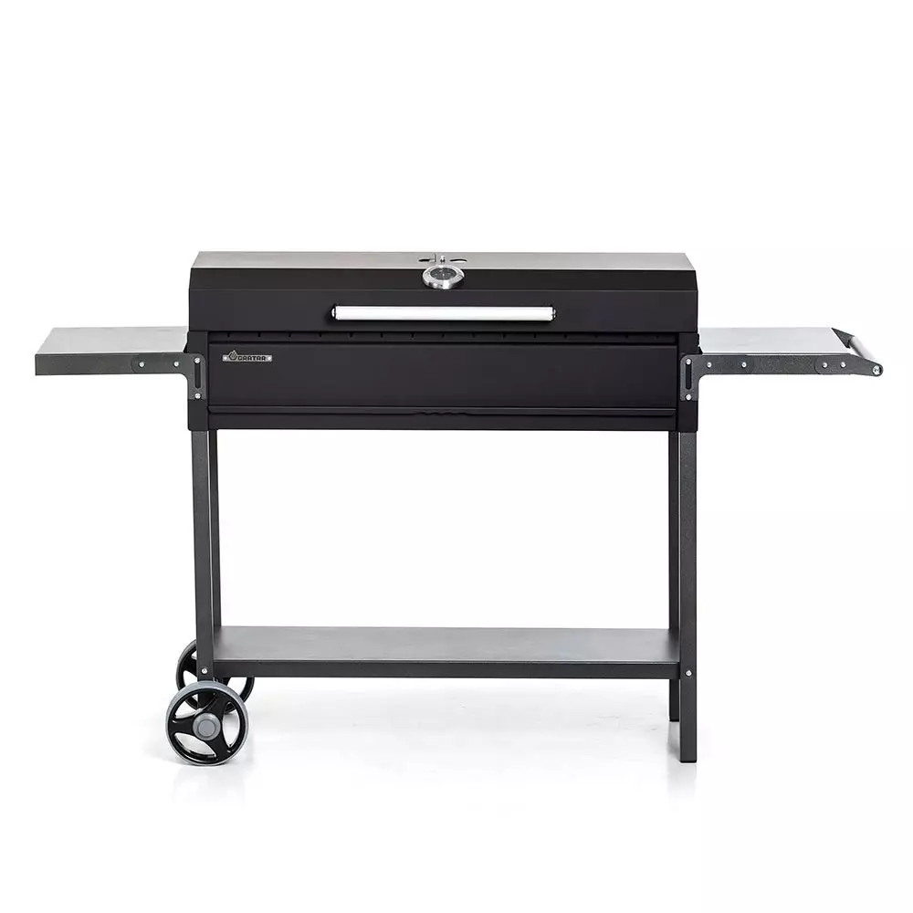 Функциональный гриль-мангал GRATAR МАН 305 из толстой стали со складными полками и крышкой барбекю. Крышка оборудована термометром и заслонкой для регулировки притока воздуха.