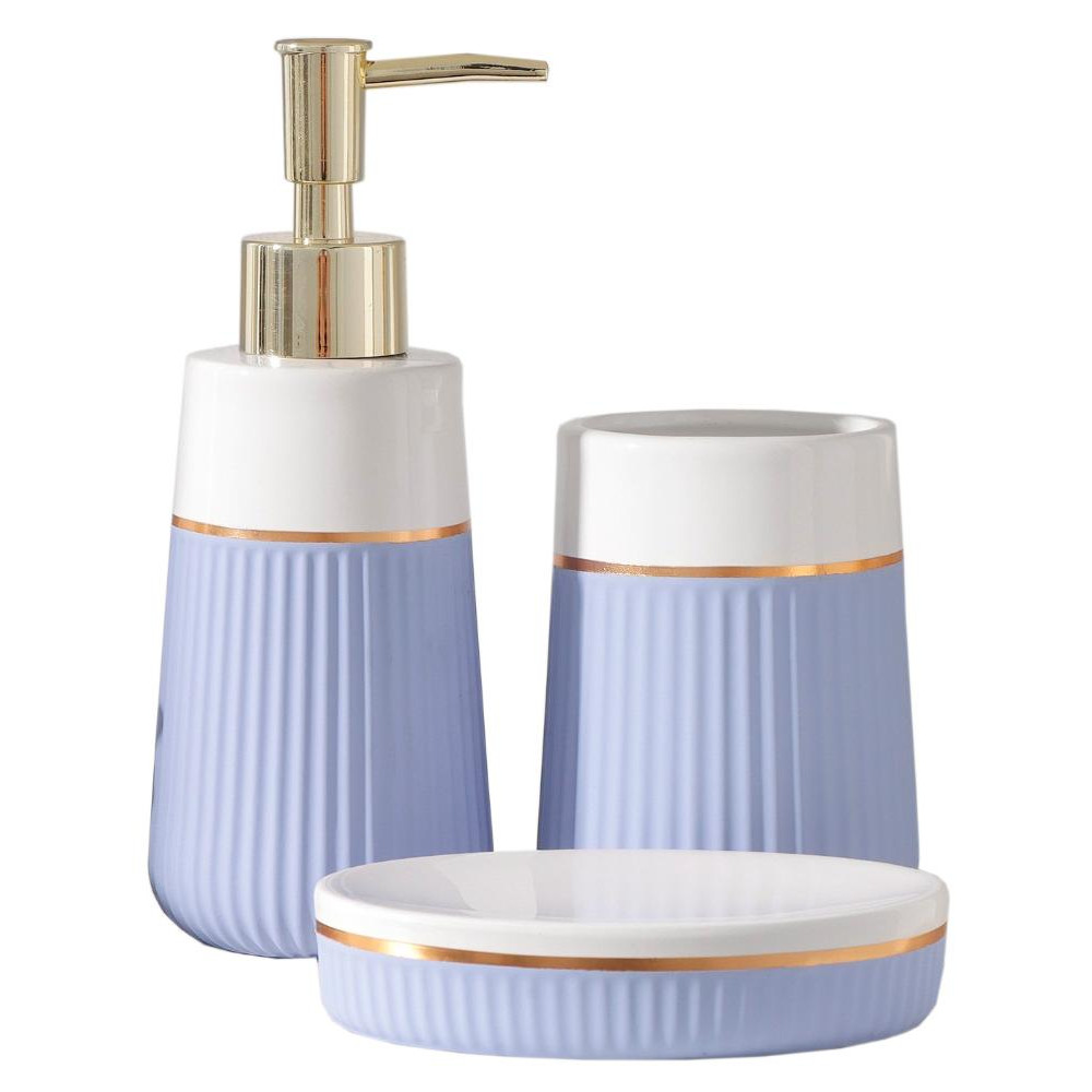 Набор аксессуаров организует пространство и станет стильным украшением Вашей ванной комнаты. За счет сдержанного дизайна данный керамический набор в ванную подойдет к любому дизайну ванной комнаты. Набор состоит из 3 предметов: дозатор, стакан, мыльница.