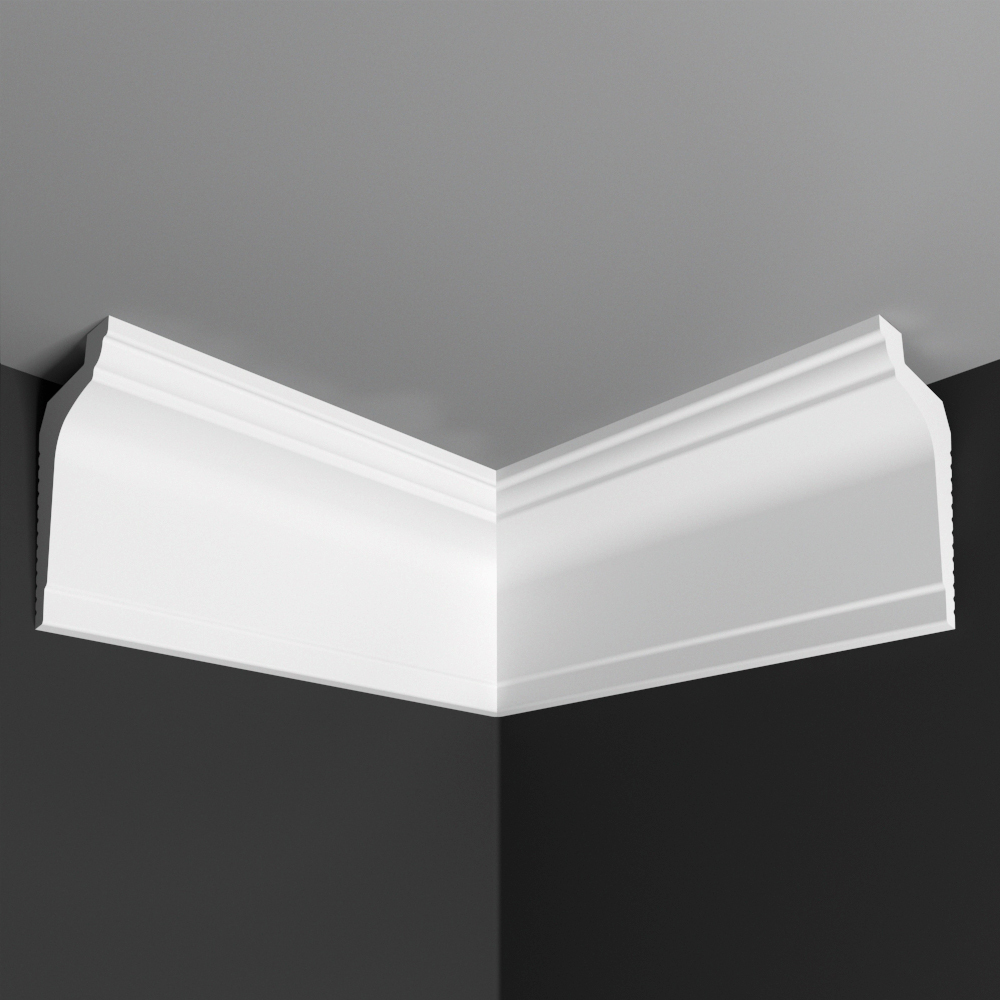 Готовый внутренний угловой элемент для плинтуса потолочного ДЕ-БАГЕТ П 07 35/35. Изготовлен из двух частей плинтуса, склеенных вместе. Применение готовых угловых элементов позволяет сильно упростить процесс монтажа потолочного плинтуса.