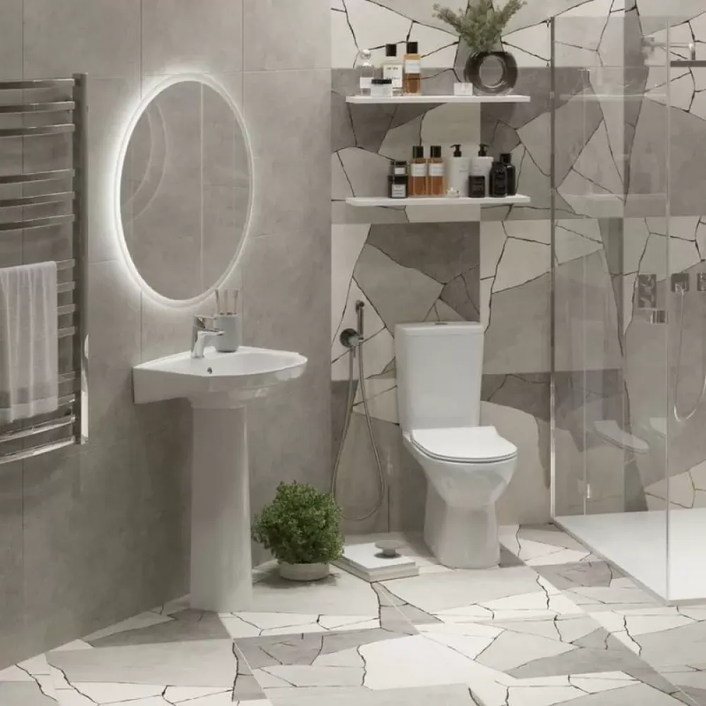 Плитка керамогранит 600*600 КЕРАМИН Фэйт 5 имеет рисунок под бетон. Этот напольный керамогранит отлично подойдет для ванной, кухни, туалета, коридора, гостиной и других помещений. Керамогранит имеет ректифицированный, очень ровный край.