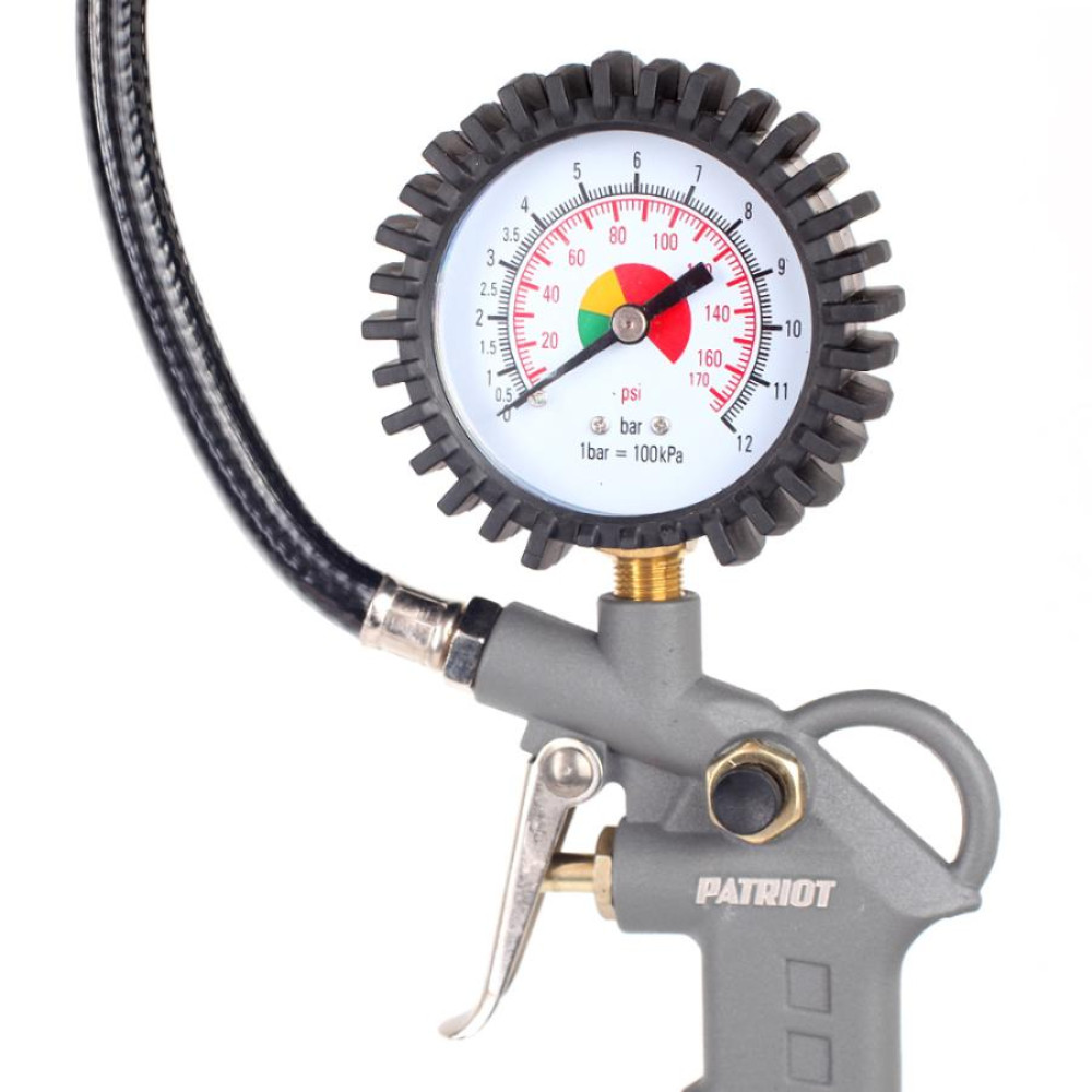 Пистолет для накачки шин Patriot GN 60D. Оснащен корпусом из алюминиевого сплава с клапаном сброса давления, манометром Ø60 мм (0-10 бар), шлангом 400 мм и наконечником 25/W.