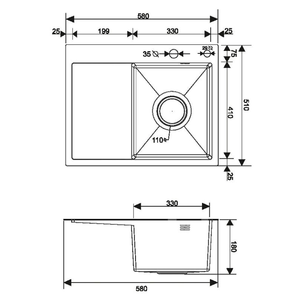 | Типмойка кухонная | Диаметр отверстия под смеситель35 мм | Диаметр слива110 мм |