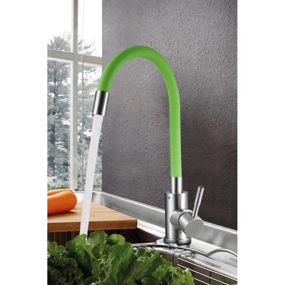 Смеситель для кухни SOLONE EZA4-F090 GN с гибким силиконовым изливом зеленого цвета изготовлен из высокопрочной нержавеющей стали, что обеспечивает прочность корпуса смесителя. Излив надежно фиксируется и не деформируется от постоянных сгибов. Благодаря гибкому изливу этот смеситель универсально подходит к кухонным мойкам практически любых размеров и форм.