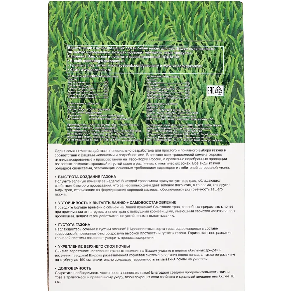 Технические характеристики Семена газона ГазонCity Настоящий универсальный 1кг (309379)