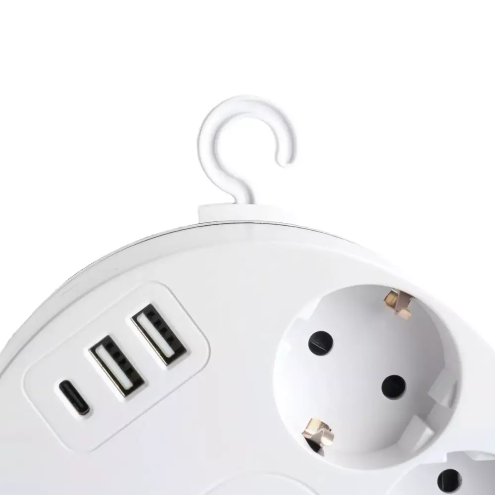 Удлинитель имеет 2 выхода USB Type A и 1 выход USB Type C. Также данный удлинитель имеет сбоку основания автоматический выключатель, который срабатывает при превышении номинального тока нагрузки (16 А) и отключает электроприборы от сети.