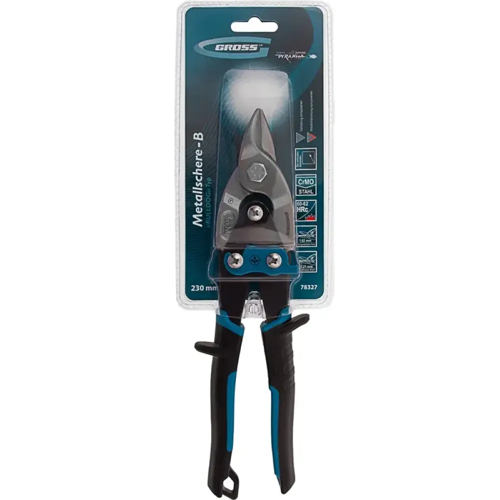Ножницы по металлу 230 мм GROSS PIRANHA 78327 отличаются прямым усиленным резом. Износостойкость и повышенный рабочий ресурс обеспечивают прочные губки, изготовленные из Сr-Mo стали. Данные ножницы подходят для разрезания листов из различных металлов. Благодаря ограничителям для пальцев на рукоятках обеспечена безопасность при выполнении работ.