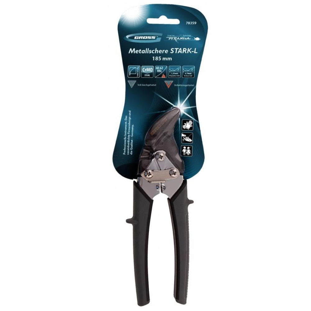 Ножницы по металлу Gross PIRANHA 78359 длиной 185 мм, из стали CrMo, с двухкомпонентными рукоятками, предназначены для прямого и криволинейного левого резания листовых заготовок. Двойной рычажный механизм экономит усилия и повышает производительность ножниц. Общая длина инструмента составляет 185 мм, поэтому он удобен для работы в труднодоступных местах. Ножницы рекомендованы для профессионального применения, пригодятся также и в быту.