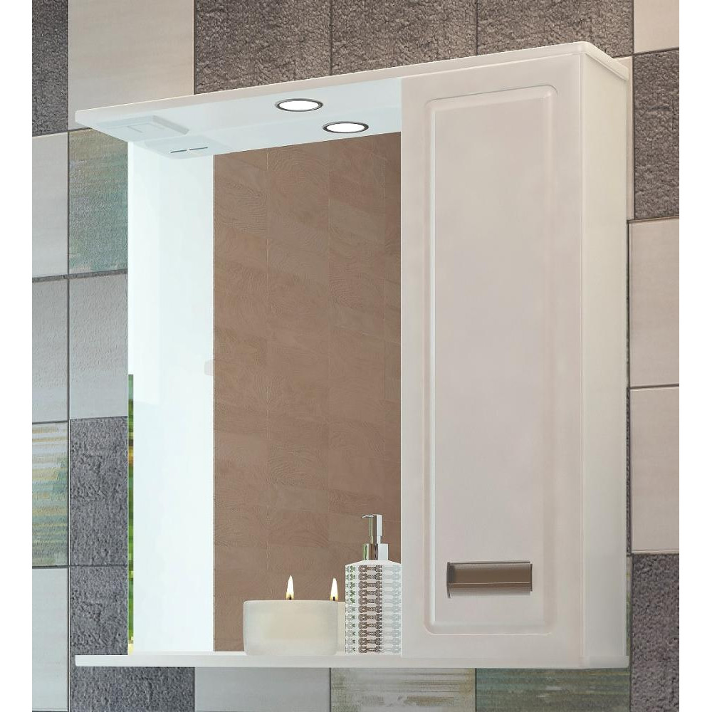 Зеркало-шкаф EVA GOLD 70 "Odri" - компактная модель для небольших ванных комнат с широким спектром возможностей. За фасадом шкафчика расположена жесткая полка. Материал корпуса - влагостойкие МДФ, зеркало произведено с применением влагостойкой амальгамы. Зеркало-шкаф исполнено в строгом традиционном стиле в белом глянцевом цвете. Модель сможет вписаться в любой интерьер.