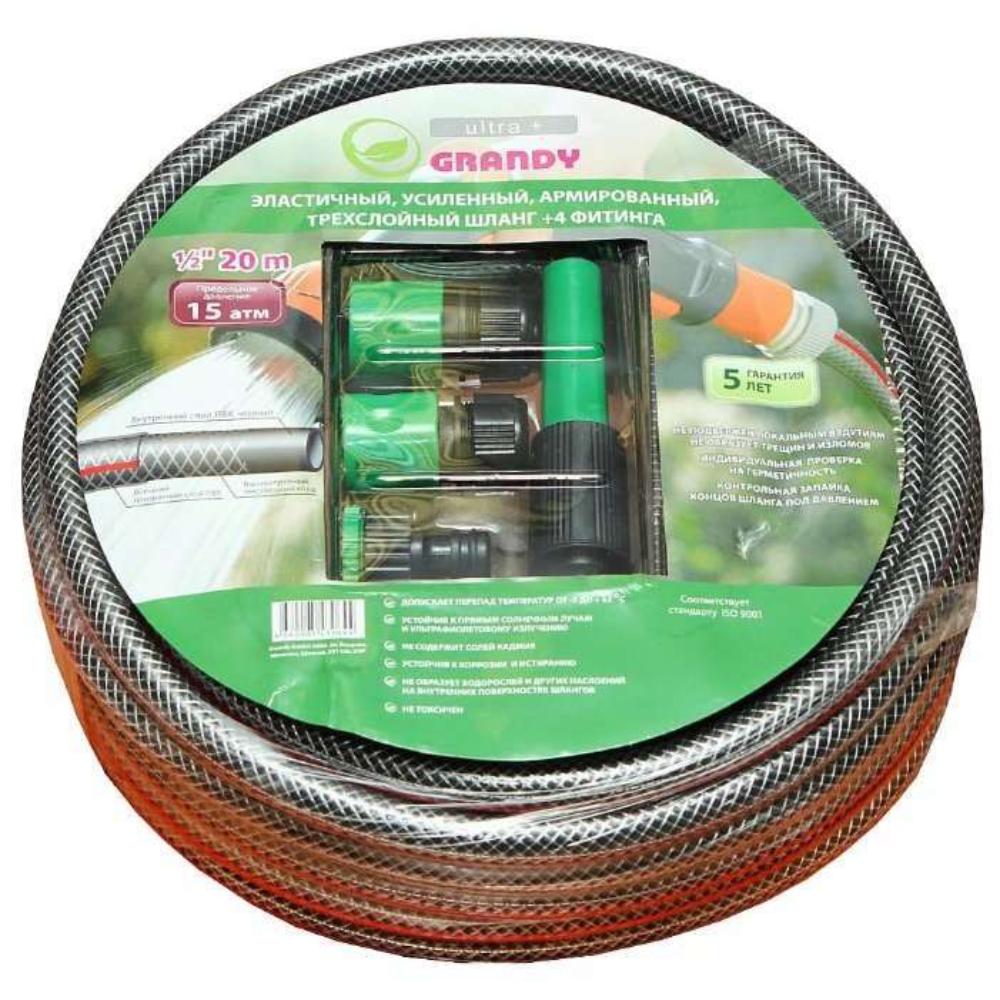 Шланг поливочный GRANDY ULTRA+ 1/2, 20м армир 3-х сл + фитинги