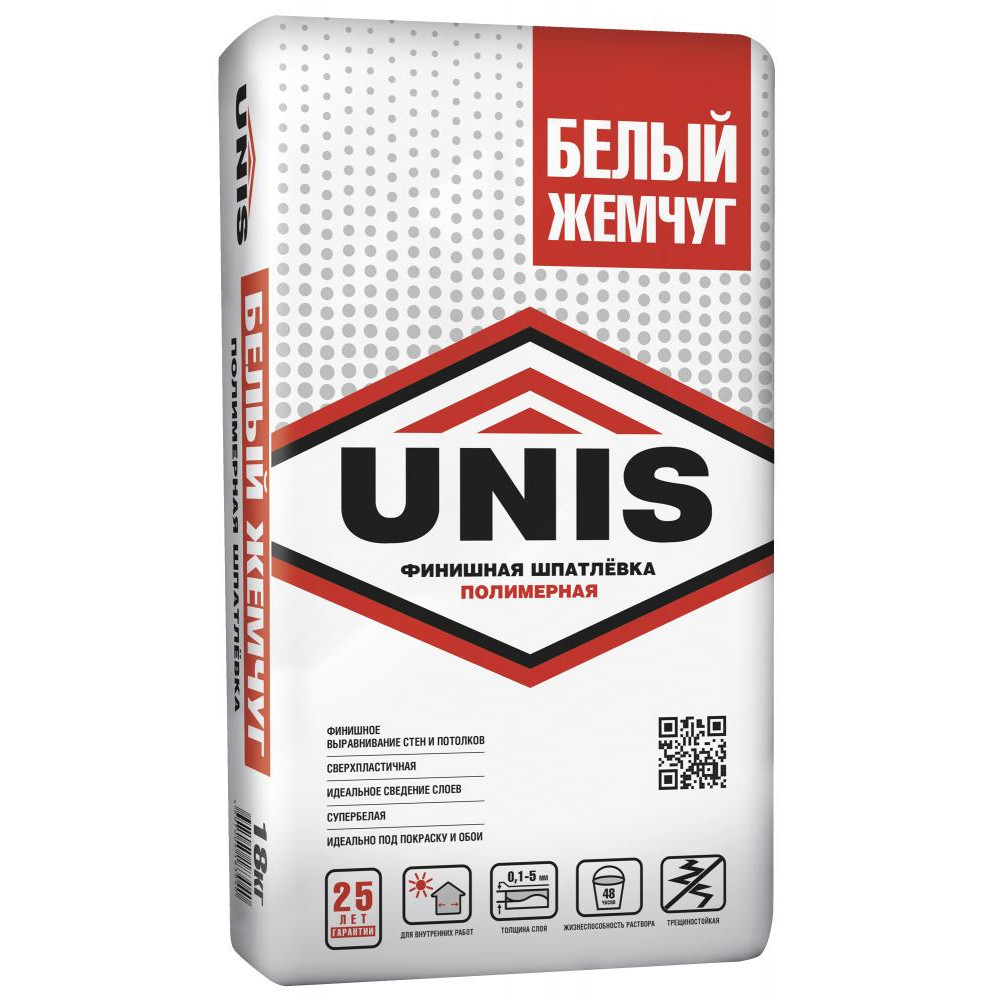 Шпатлёвка UNIS полимерная финишная Белый жемчуг предназначена для окончательного выравнивания поверхностей стен под последующую финишную отделку (поклейка обоев, окрашивание, нанесение декоративных материалов). Особенно рекомендуется в качестве финишной отделки потолков. Применяется внутри отапливаемых помещений с нормальной влажностью. Применяется по недеформирующимся основаниям: бетонным, гипсовым (в том числе ГКЛ, ГВЛ, ПГП) и цементным.