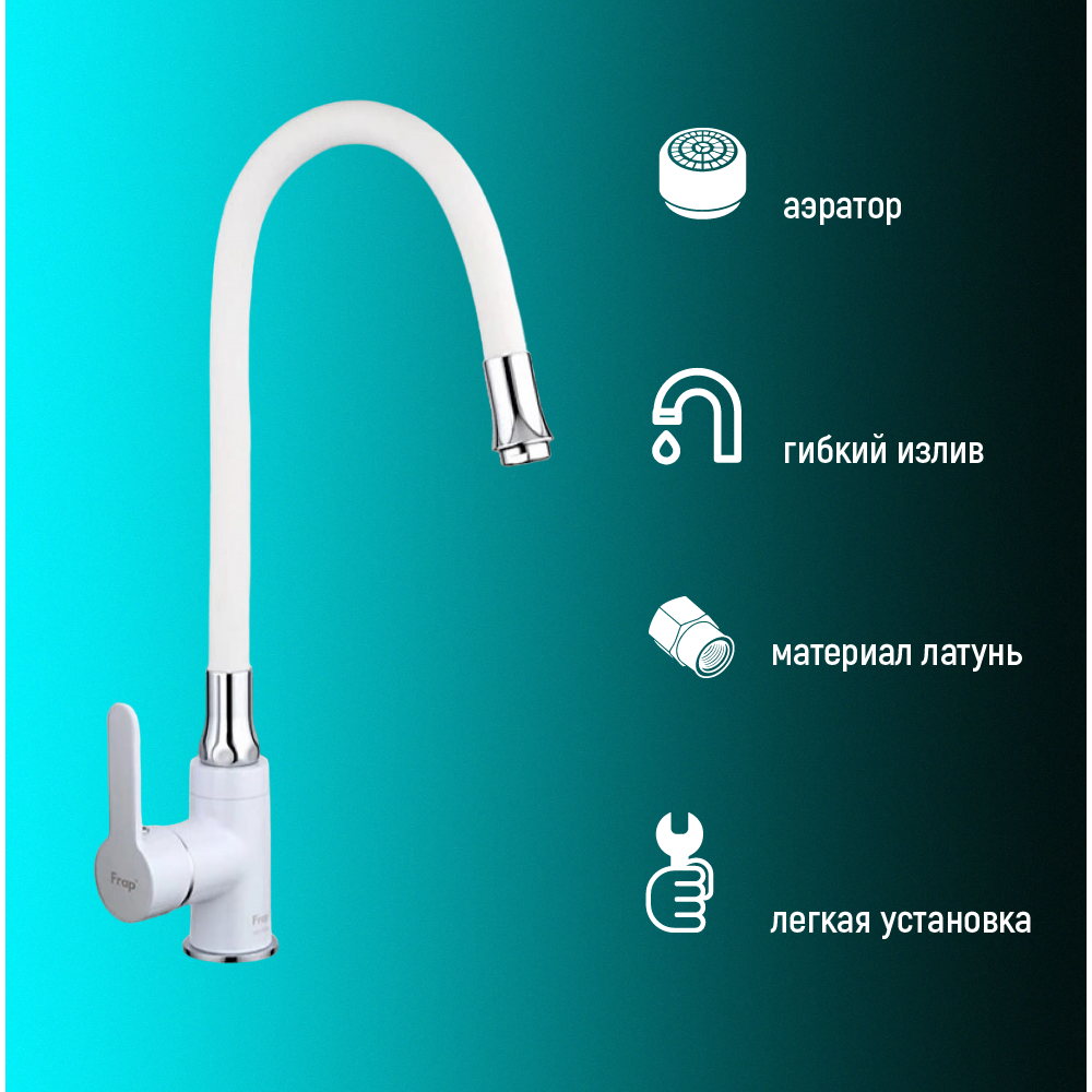 Технические характеристики Смеситель для кухни FRAP F4041 боковая ручка,гибкий излив,белый/латунь