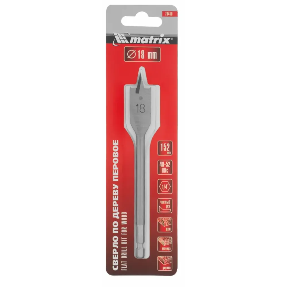 Сверло по дереву перовое MATRIX 18 6-гранный хвостовик (70410) имеет рабочую часть в виде «лопатки» с режущими кромками по бокам, поэтому эффективно для сверления глубоких сквозных и глухих отверстий. Устанавливается на ручную механическую, электрическую дрель или шуруповерт, эффективно для сверления древесины любых пород.