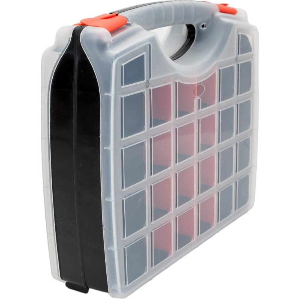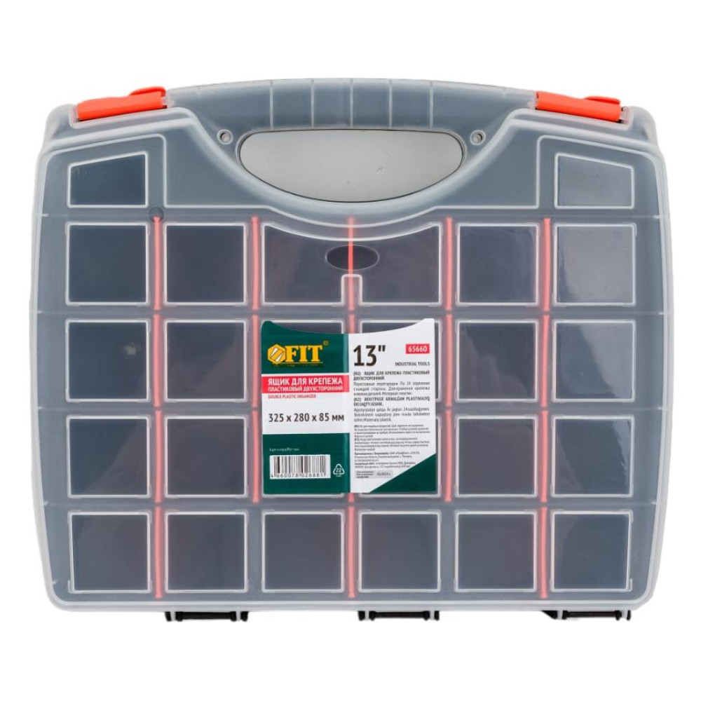 Двухсторонний органайзер FIT 13" 325х280х85мм (65660) используется для хранения крепежа, различных хозяйственных принадлежностей. Модель выполнена из высококачественного пластика, который отличается прочностью и долговечностью.