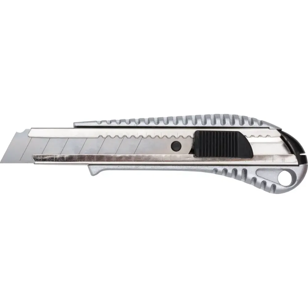 Компактный корпус изготовлен из алюминиевого сплава, сегментированное лезвие из высокоуглеродистой инструментальной стали состоит из 15 сегментов, гарантирует устойчивость во время работы. Нож имеет металлические направляющие и фиксатор лезвия.