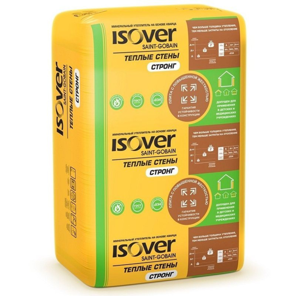 Isover Теплые Стены Стронг – плиты повышенной жесткости, которые гарантируют устойчивость в конструкции. Это тепло-звукоизоляция из минеральной ваты с усиленными водоотталкивающими свойствами. Материал производится из природных компонентов: кварца, соды, известняка. Является безопасным материалом для здоровья человека и окружающей среды: сертифицирован для применения в детских и медицинских учреждениях.