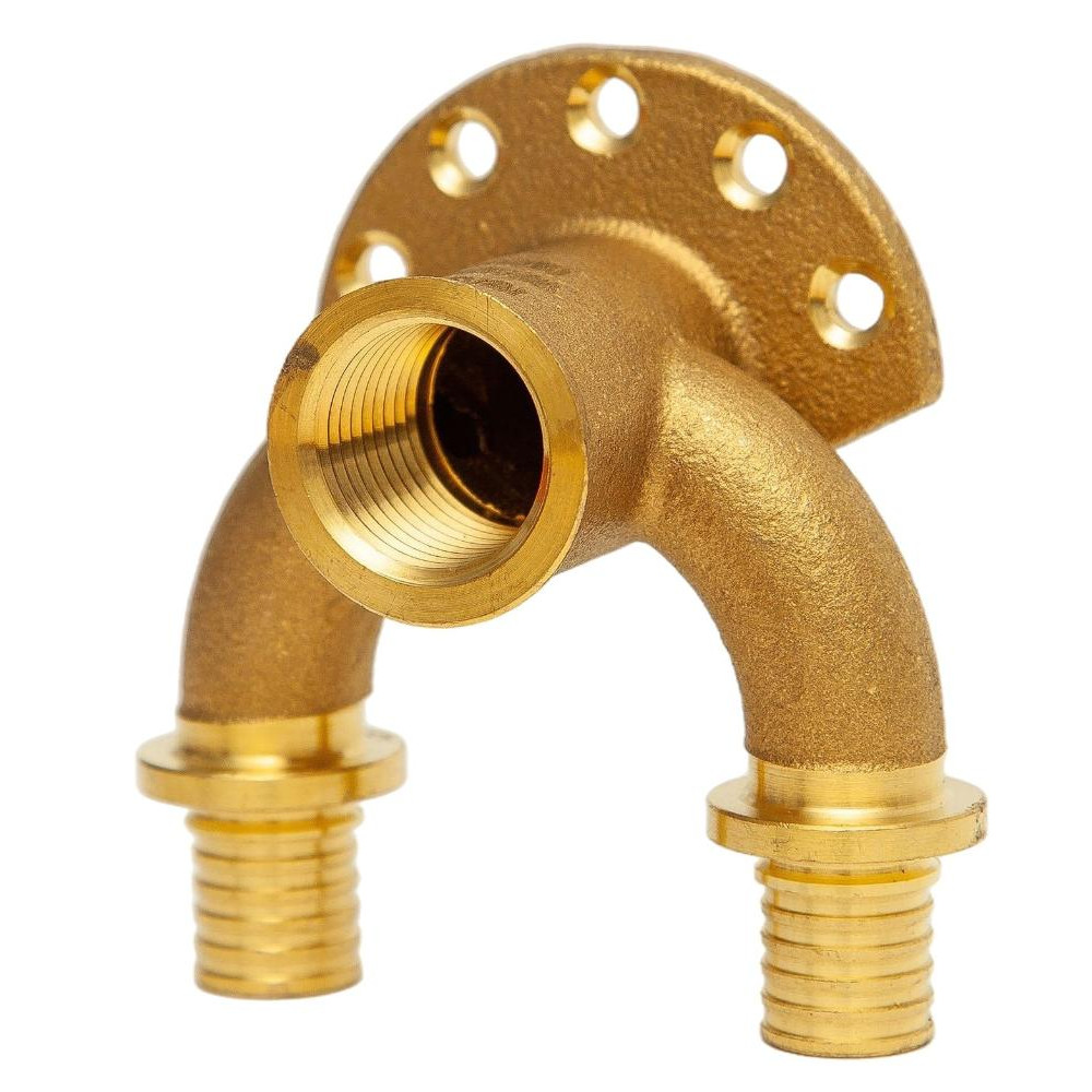 Колено имеет один вход и один выход. И резьбовой выход 1/2" на потребителя (точки водоразбора). Для удобства крепления на стену, водорозетка имеет монтажную площадку с отверстиями для крепежа. Колено используется для создания соединения в системе аксиальных фитингов для труб из сшитого полиэтилена.