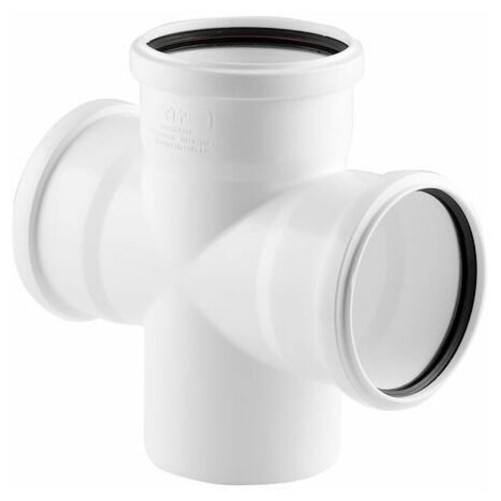 Крестовина канализационная диаметром 110 мм с углом на 90 град изготовлена из полипропилена. Основное предназначение крестовины – это соединение трех потоков приходящих под разными углами в один общий с дальнейшим отводом стоков в общую канализационную систему или в ЛОС. Резиновые уплотнительные кольца, установленные в раструбы, обеспечивают герметичное соединение и в случае необходимости позволяют легкого разобрать требуемый участок канализационной системы.