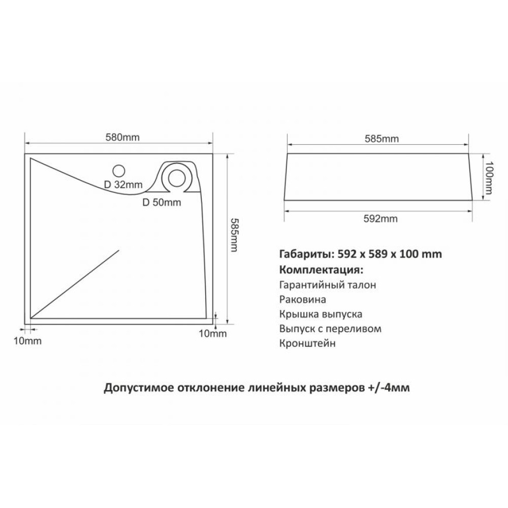 | Типумывальник | Диаметр отверстия под смеситель32 мм | Диаметр слива50 мм |