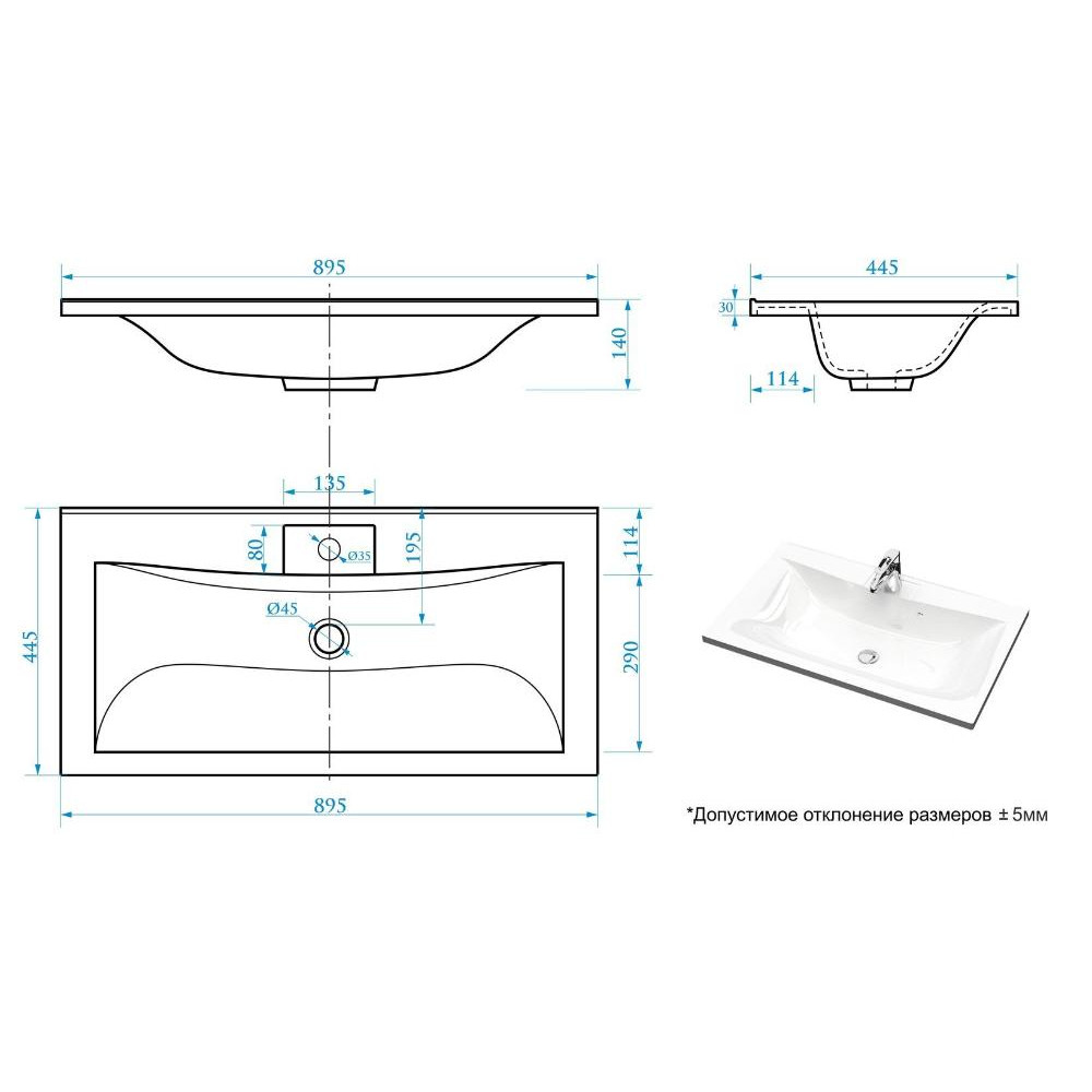 | Типумывальник | Диаметр отверстия под смеситель35 мм | Диаметр слива45 мм |