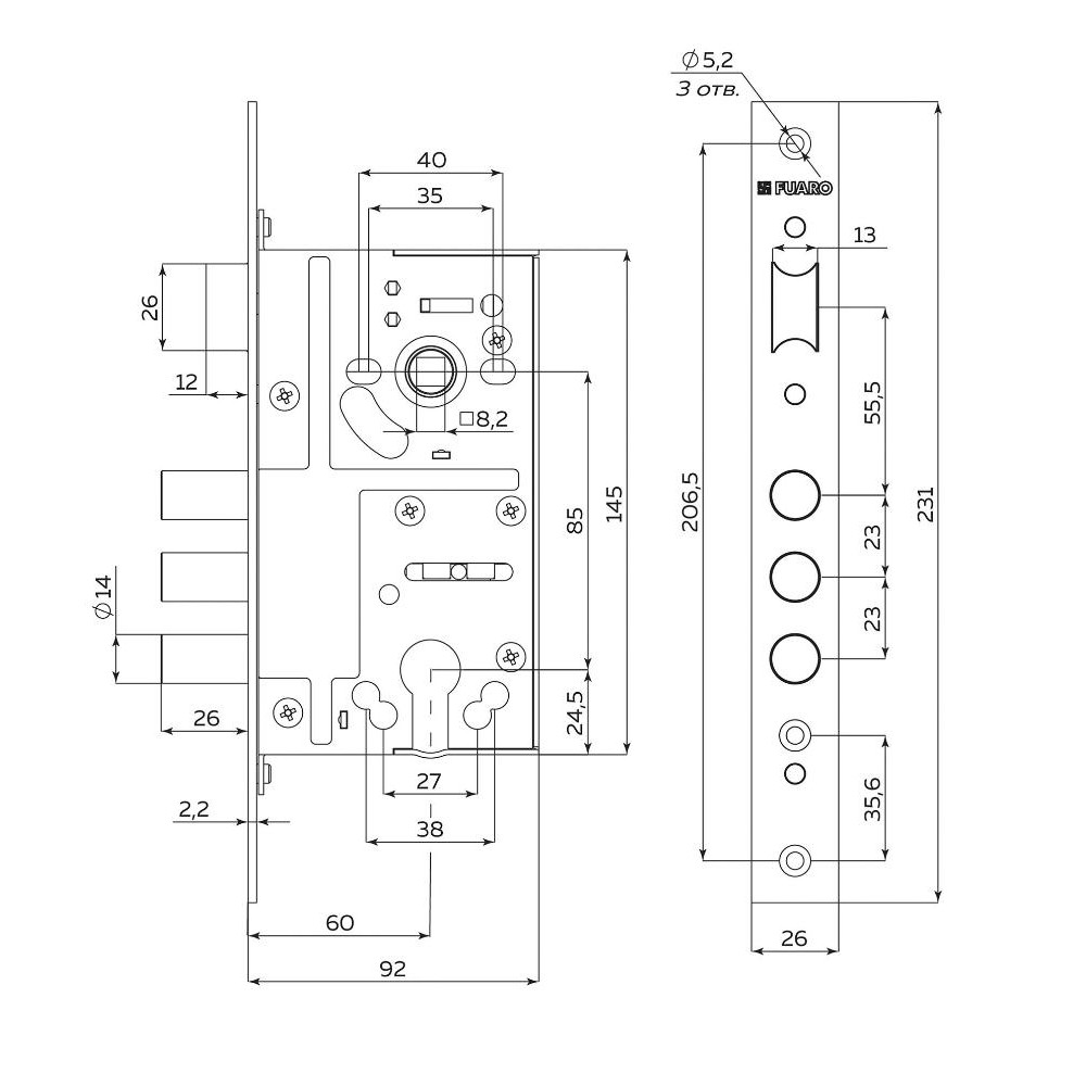 Корпус врезного цилиндрового замка Fuaro MDV811/C-60.85.3R14 с тремя ригелями и защелкой предназначен для установки во входные и технические металлические двери. Стальной оцинкованный корпус. Универсальная реверсивная защелка, подходит для левых и правых дверей. Отверстия под стяжные винты. Размер бэксета- 60 мм. Выход ригелей- 26 мм. Диаметр ригелей -14 мм. Открывание-2 полуоборота.