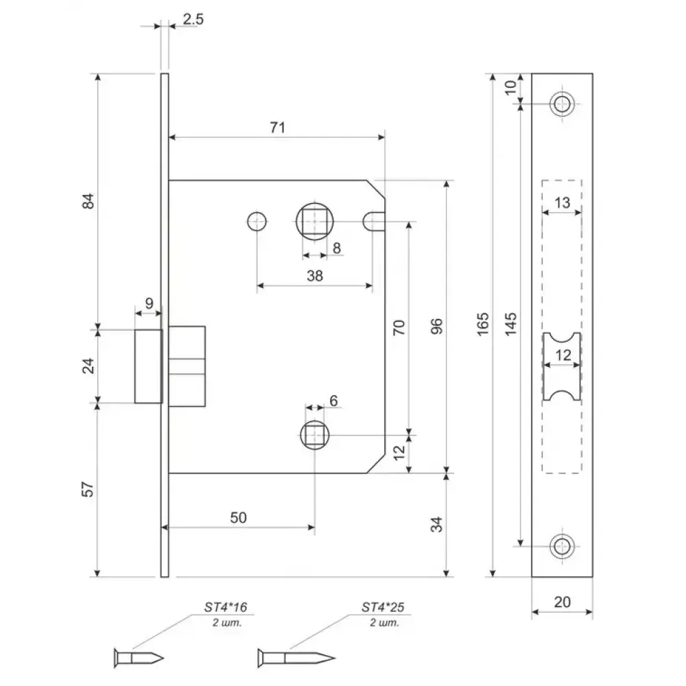 Защелка предназначена для установки вместе с дверными межкомнатными или сантехническими ручками (в комплект не входят) с квадратом сечения 8 мм и фиксатором WC с квадратом сечения 6 мм.